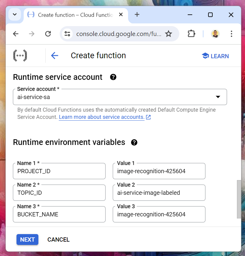 - In the runtime section:Select the service account that we created earlier, ai-service-sa. This will make sure, our service can access Vision AI and Pub/Sub.