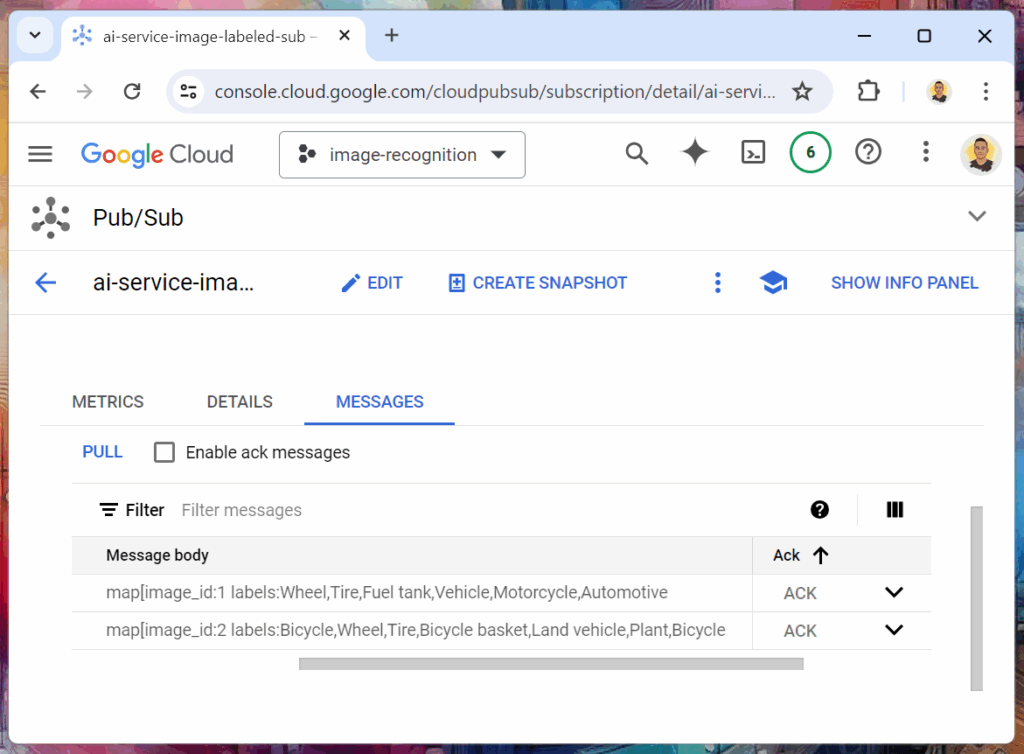 If you recall from our architecture, our AI-Service sends the labeling results to user-service-new-image topic. Therefore, we should go to the messages tab in the user-service-new-image-sub subscription page here. Click the "PULL" button, and you should see two messages from our AI-Service, as depicted in Picture No. 9 below. If you cannot see the messages after a few seconds, please check the logs in Cloud Functions to see if there are errors in the deployment.