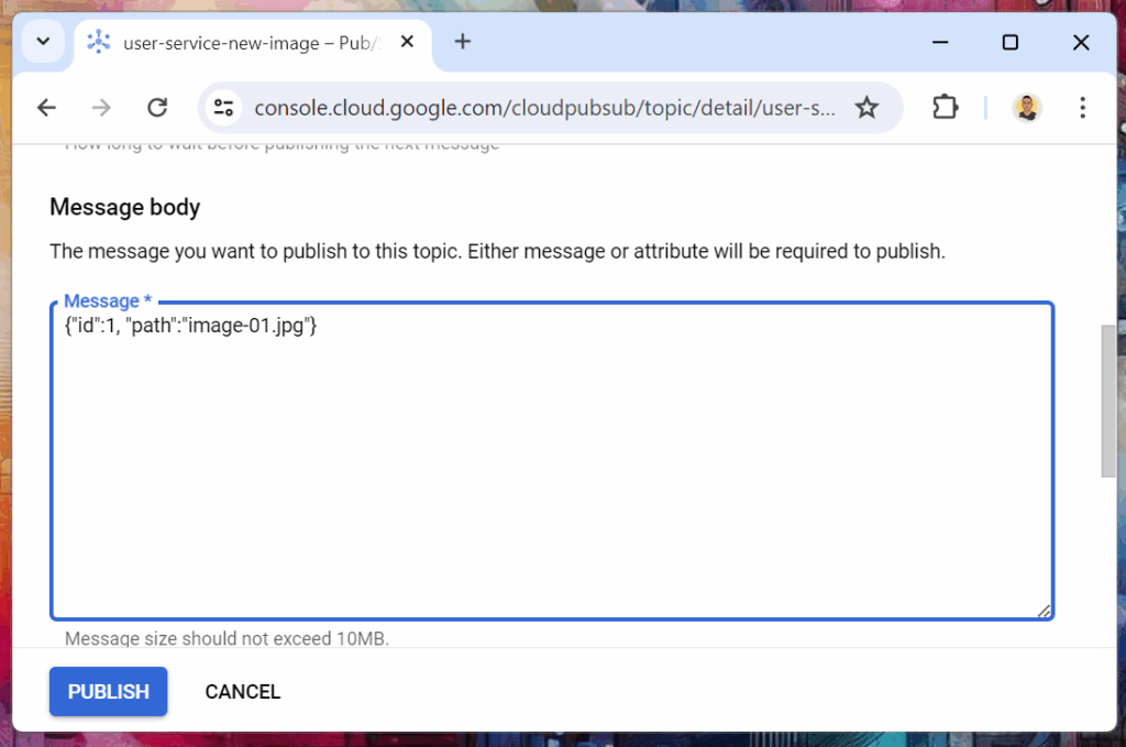 Go to Pub/Sub page, and go to the Messages tab (link here). Click "Publish Message" button and a new form will show up from the right side. In the "Message Body", put {"id": 1, "path": "image-01.jpg"} and click "Publish". Do this one more time with {"id": 2, "path": "image-02.jpg"} as the body.