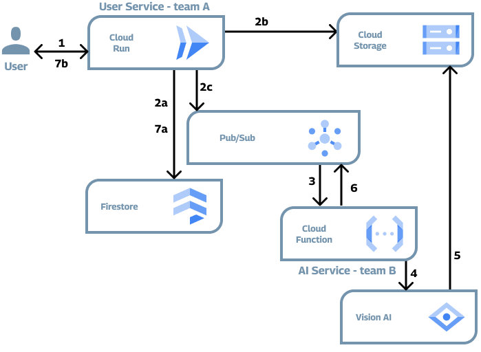 - 6: AI-Service publishes image-labeled event message to Pub/Sub, containing the labels from Vision AI.
