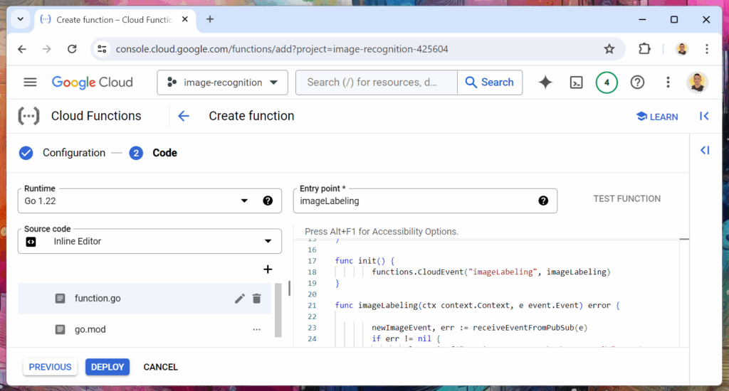 For the code of our function, we will write it in Go 1.22. The complete code can be found in the cloud-functions folder in this cloud-functions folder in the repository. Copy function.go and go.mod from that repository to the Cloud Functions and change the entry point to imageLabeling. It's fairly simple and straightforward code that you can read in a short time. However, there are a few things that you should note: