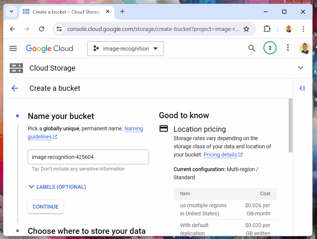 After choosing a name, we should choose the location of our bucket. For now, let's choose the "Region" option and select the region closest to you. In production, you may want to choose the "Multi-region" or "Dual-region" option closest to your users since it will provide the best performance and availability.